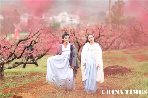 模特在桃花园林赏花 (摄影:徐晓虹)