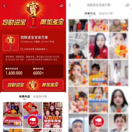 2022年1月22日至2月16日,在快手搜索“招财进宝宝进万家”,即可在该话题下参与挑战赛活动。通过伸手比心、手掌舞动、握拳等简单又充满趣味性的手势造型,将召唤出福气满满的惊喜画面,与好运表情包、红包雨、金元宝、聚宝盆等寓意美好的新春元素互动。参与快手挑战赛不仅能将“招财进宝”的祝福分享给亲朋好友,还有机会瓜分160万快币。大量年轻用户直呼福利拉满,真正实现“宝进万家”。