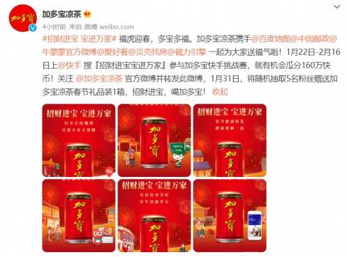 为全面营造节日氛围,实现挑战赛热度最大化,1月24日、27日,加多宝联合中国邮政、百度地图、贝壳找房等主流品牌及全国各大电视台,共同发布以“宝进万家”为主题微博互动,强势打造新春送宝CP,为快手挑战赛进一步聚集人气,形成强大流量驱动。