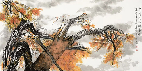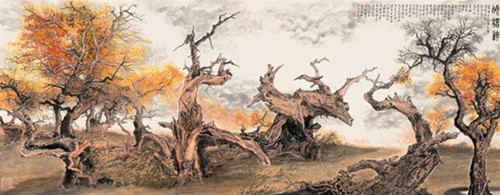 中国画家以胡杨为体裁算是稀缺,而王林森通过描绘各种生命形态的胡杨,引发自己对生命、对大自然的深刻思考,从中更深刻地体悟到“精神”对一个人、一个民族和整个人类的重要性。或许,这也是此次画展给人们的最大收获和启迪吧。然而,若不是王林森爱胡杨、懂胡杨、敬重胡杨,怎么能把胡杨的生命姿态描绘得如此形象而生动?他的“胡杨情”正如他的一幅新作题跋“谁言秋景不如春,最美大漠胡杨林。” (晓嘉)