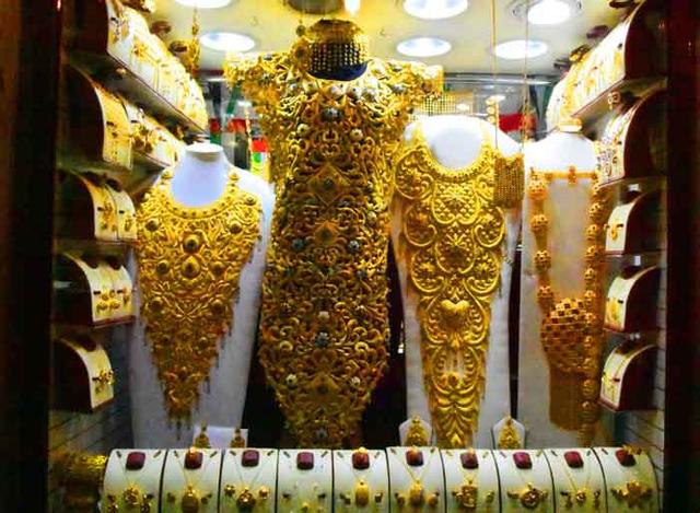 过河登岸后步行不远,穿街走巷即来到了迪拜老城区的黄金街。这里是世界第三大的黄金交易集散地。整个黄金街就真的只有一条街,全长不到一公里,但这里店面之多,出售黄金饰品种类之多,卖黄金像卖白菜一样,绝对令人瞠目结舌。