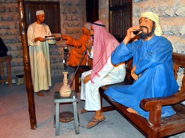 走进商人大屋,里面复原了当年大屋的陈设。有床铺和厅堂,最令人瞩目的是土空调。高出棚屋的风塔,十字形的风口,可以引进四面的来风,站在风口下可以体会到阵阵清风。走出古代商人大屋,来到迪拜博物馆的地下通道内,犹如进入了时光隧道。这里呈现出了栩栩如生的贝多因人的世界。有和实际尺寸一样的古市集、如活人般的铁匠、珠宝商和裁缝师。博物馆里还有像好莱坞制片厂一般的场景:真实大小的骆驼、绿洲、营火等。