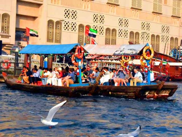 结束了博物馆的参观,团队迪拜首日的最后行程是乘阿拉伯三角船摆渡过迪拜海沟咸水湾,前往对岸的黄金街。此时,人们乘坐的木船游弋在水上,记者看见来往穿梭的类似船只,不由得回想起不久前刚刚去过的意大利威尼斯水城乘坐的贡多拉。虽然此船非彼船,但却莫名地引发了一种令记者回味的船游之感。