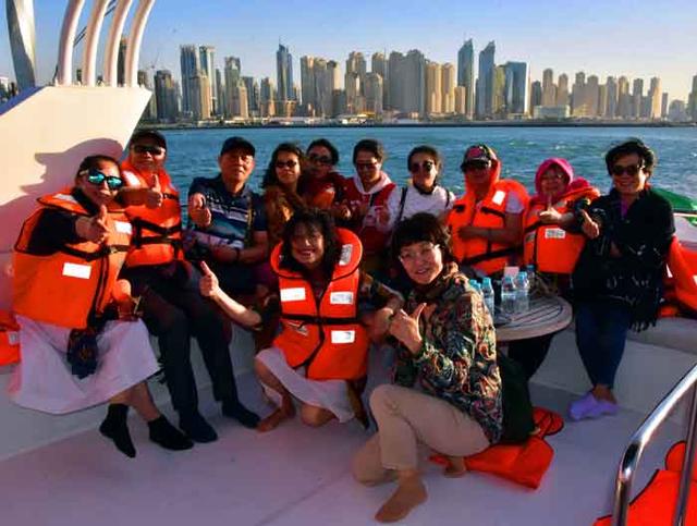 团友们泛舟波斯湾海畔所乘游艇,虽然不敢说有多豪华,但是作为海上泛舟而游是足够了。特别是团友们坐在甲板上,以迪拜的高楼为背景,无论怎样都能拍出摩登的人像照。游艇出海航行一大圈,一路乘风破浪、欢歌笑语,驰聘在阿拉伯海岸线的感觉,令人深感无比惬意。