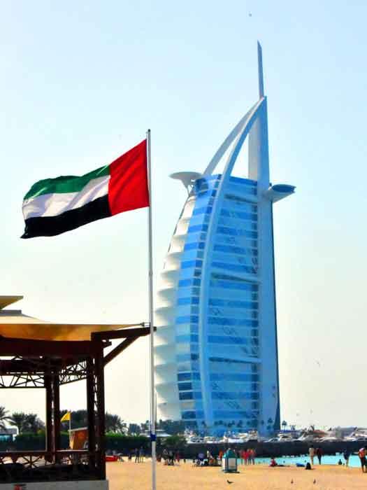 结束了首个景点的观光,团队乘中巴车在回返市区,记者发现原来通往棕榈岛的观光列车线就在头上方,原来这条观光列车线与地下的公路并驾齐驱。我们的车子离开波斯湾海畔不久,即来到了迪拜的茱美拉海滨,车子行驶在路上,透过车窗就能看到位于大海之畔的帆船酒店。
