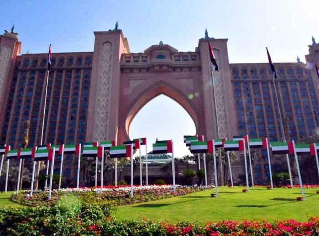 我们的轻轨观光列车终点是棕榈岛上的亚特兰蒂斯酒店。车行途中,两面的海景风光尽收眼底。著名的帆船酒店就在左侧。列车也就行进了十几分钟就抵达了终点。下车后,团友们顺着海畔大堤观赏波斯湾海景。而与大海只有一条马路之隔的就是壮观的亚特兰蒂斯大酒店。该酒店耗资15亿美元兴建,坐落阿联酋迪拜的棕榈人工岛上,占地113亩,有1539个房间,如同古波斯和古巴比伦建筑装潢风貌。