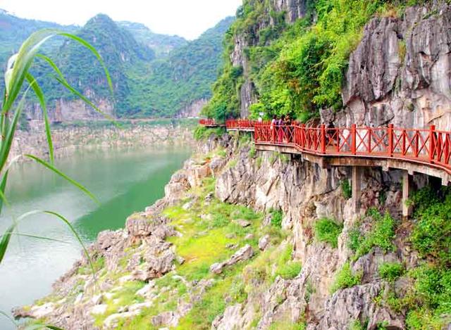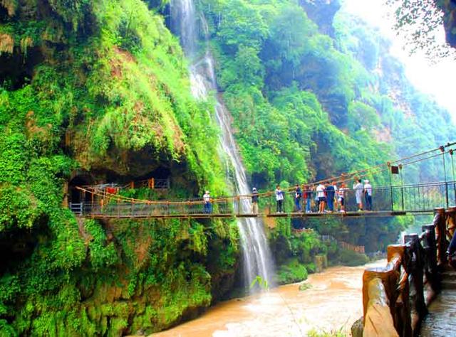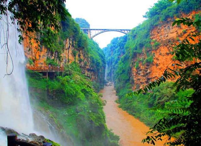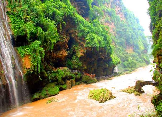 漫步于峡谷的山间栈道而游,无论你从峡谷两岸的哪边走,都能见到这样的景致,那就是峭崖对峙,谷深流急,银瀑飞泻;滩险急流处,水石相搏、惊涛拍岸、震耳欲聋。崖画、千泉、万洞两岸悬挂。从河床昂首两岸,在蓝天白云的映衬下,尤如天沟;从峡谷大桥俯视谷底,湍急的河流恰似地缝。景观最为奇特的钙化瀑布群,谷深、流急、瀑多、原始生态保护完整,岩画如此多娇,构成了"西南奇缝,天下奇观"。