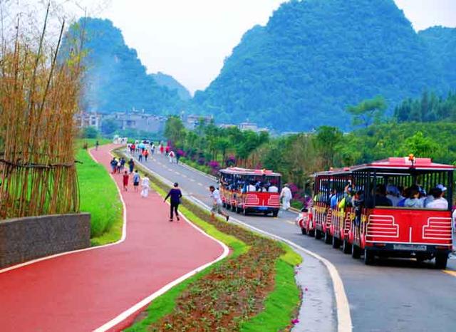 坐在小火车上进入景区犹如进入了一幅浓墨重彩的大自然画卷,人们无不被眼前的接踵而来的各种景致所陶醉。时而满目的花田一派妖娆,时而流淌的河水越过眼前;一望无际的绿色稻田在群山的环抱中与村寨、林木交相辉映。在公路的一侧还有一条用红色塑胶铺就的步行道,只见道路上徒步行走的游客,有的缓步而行,有的矫健如飞,络绎不绝。构成了这里的一道独特风景线。
