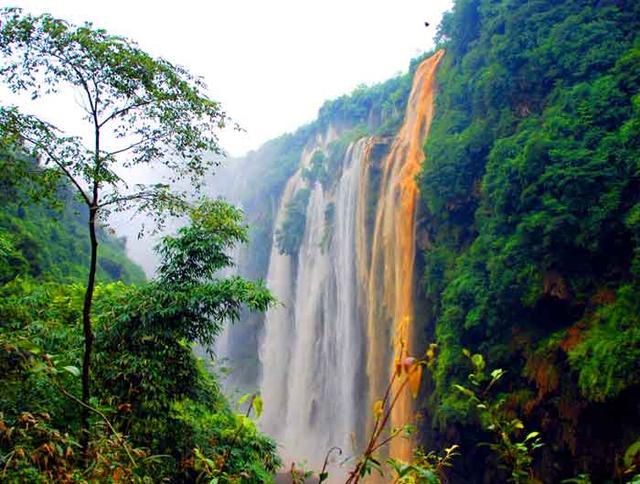 顺着植被茂盛的山道婉转而下,顿时一股震耳欲聋的水流轰鸣声撞入耳鼓,顺着声音望去,只见从天而降的飞瀑顺着山崖滚淌下来,好不壮观。而且,在狭长的大峡谷中,不是一条,而是多条似万马奔腾般地倾泻而下。那种震撼的场面真是很难用确切的语言所表述。