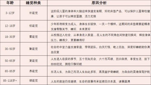 据了解,这8种觉囊括从新生到暮年的8个阶段,每个阶段根据人的身体发育需求、身体特征,结合所处年龄阶段、社会环境等因素,来选择不同的床垫,进而满足人在每个阶段好好睡觉的需求。