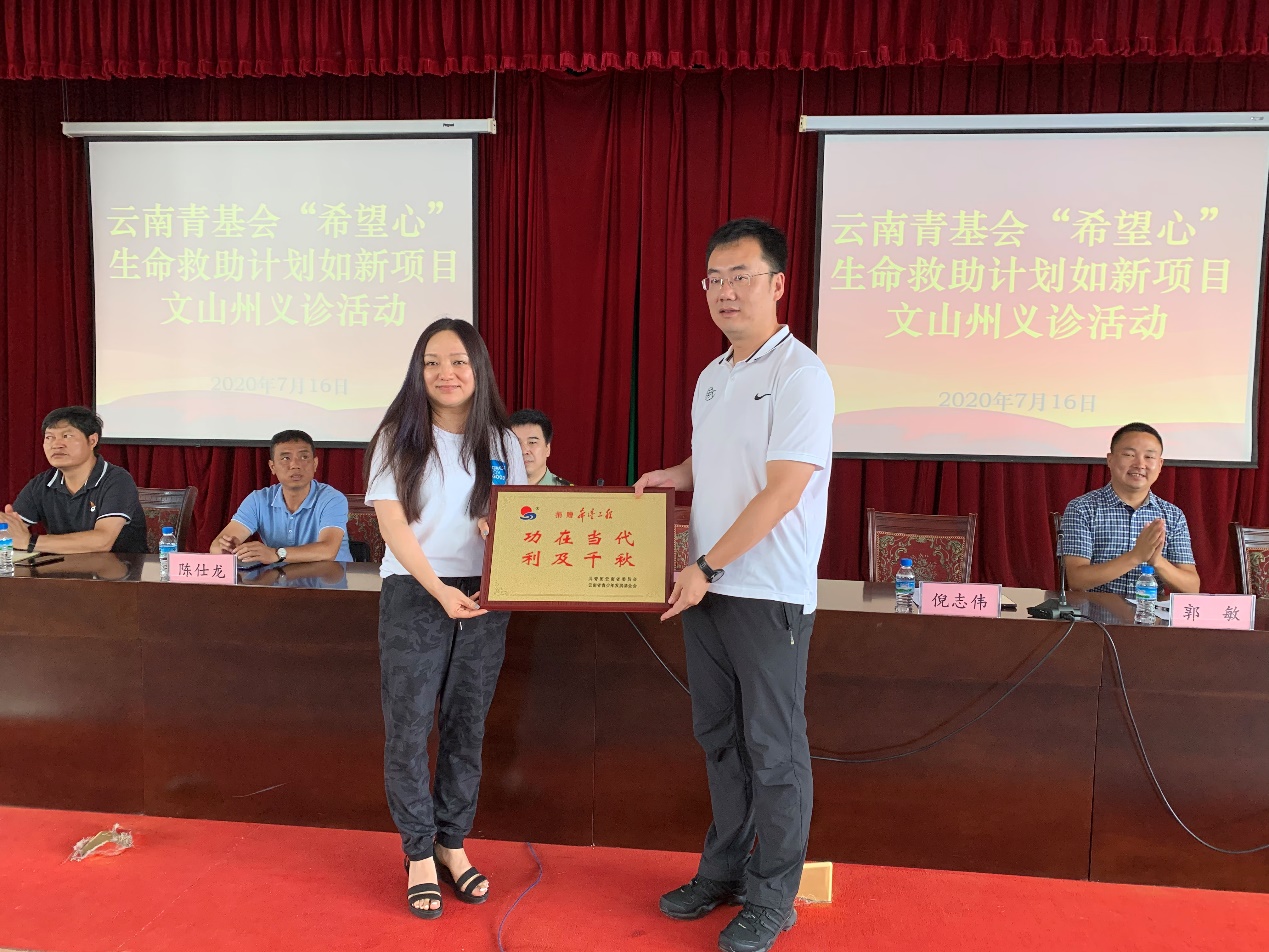 云南青基会理事长倪志伟向如新公益基金会秘书长张洁赠予纪念牌匾