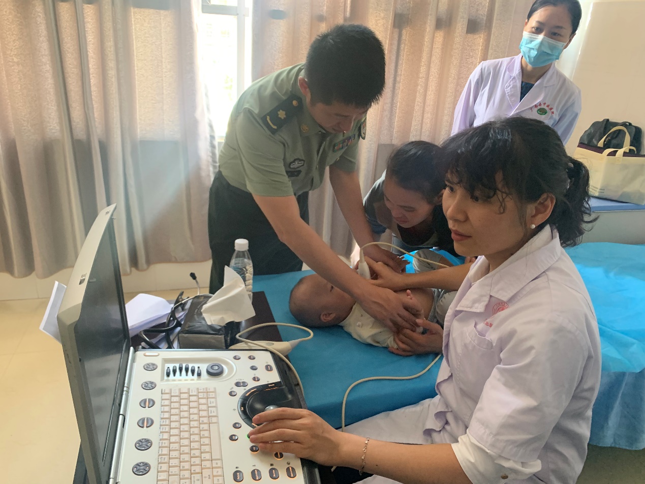 筛查组医护人员为当地儿童进行心脏彩超检查
