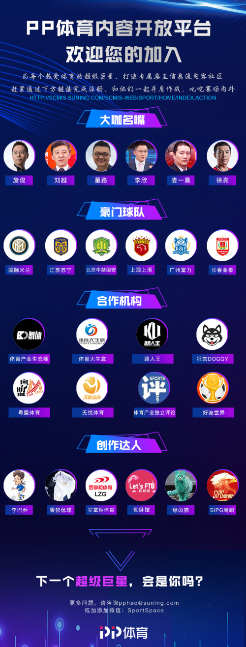目前已有多名大咖名嘴、豪门球队、媒体机构和自媒体入驻PP体育内容开放平台,不仅汇聚了詹俊、刘越、董路、李欣、娄一晨等顶级王牌解说的犀利观点,更有国际米兰俱乐部、北京国安、上海上港、江苏苏宁等豪门球队第一时间分享的队内资讯,有狂言Doggy、粤盟体育、无忧体育、路人王等体育MCN合作机构的强势输出,当然也有李巴乔、罗掌柜体育等体育内容创作者。