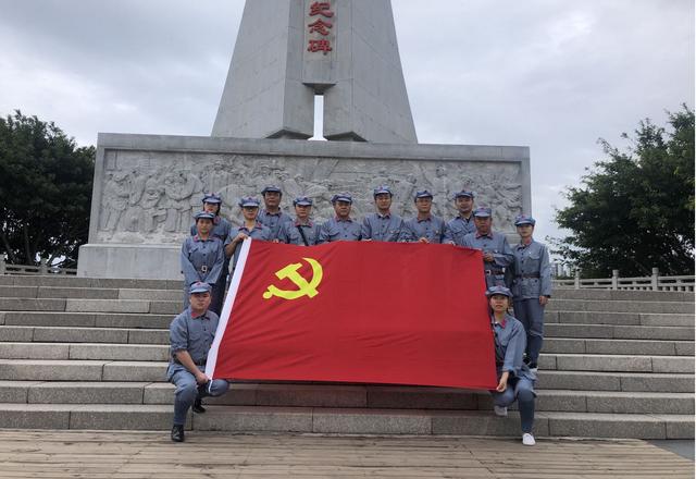 在红军长征出发纪念碑前向党旗庄严宣誓并与党旗合影