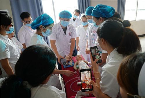 上午11:00,由NICU医护人员进行“新生儿窒息复苏”培训。他们利用新生儿模拟人生动地再现了抢救室里“新生儿窒息复苏”的全过程。