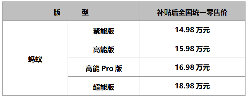 9月22日,备受行业及消费者关注的A级纯电SUV——奇瑞新能源蚂蚁在北京正式上市。蚂蚁新车公布将提供聚能版、高能版、高能Pro版以及超能版四款版型,补贴后售价14.98万元起。作为奇瑞新能源全新@LIFE平台诞生的首款新世代高能纯电SUV,蚂蚁采用超轻量化全铝车身架构,拥有全新自然美学造型、高能超宽适智享座舱、高能仿生安全守护、高能操控乐趣驾驭、以及可靠高效智慧三电等全能型产品优势,为用户打造全新高能绿色智慧出行生活。