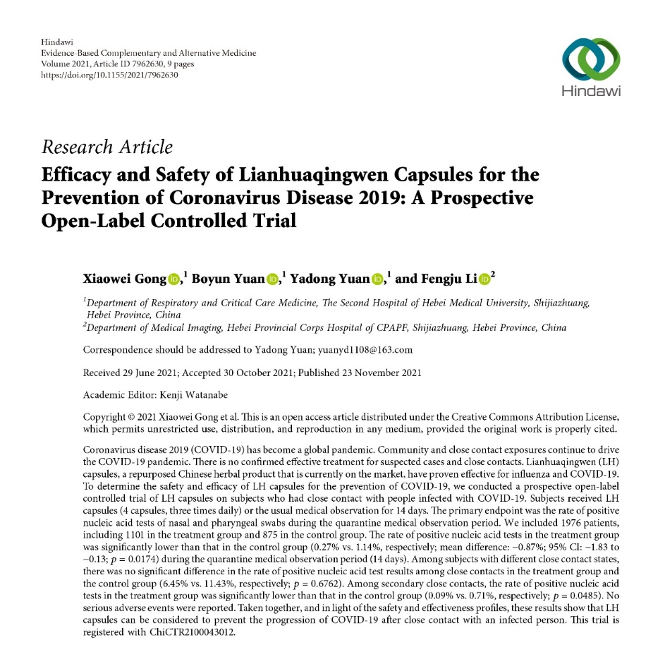 由国内20余家新冠肺炎收治医院共同参与的“中药连花清瘟治疗新型冠状病毒肺炎前瞻性、随机、对照、多中心临床研究”,结果发表于国际植物医学领域影响因子较高的杂志《植物医学》。该研究结果显示,在常规治疗基础上联合应用连花清瘟胶囊口服14天可显著提高新冠肺炎发热、乏力、咳嗽等临床症状的改善率,明显改善肺部影像学病变,缩短症状持续时间,提高临床治愈率,缩短核酸转阴时间,而且安全性较高。