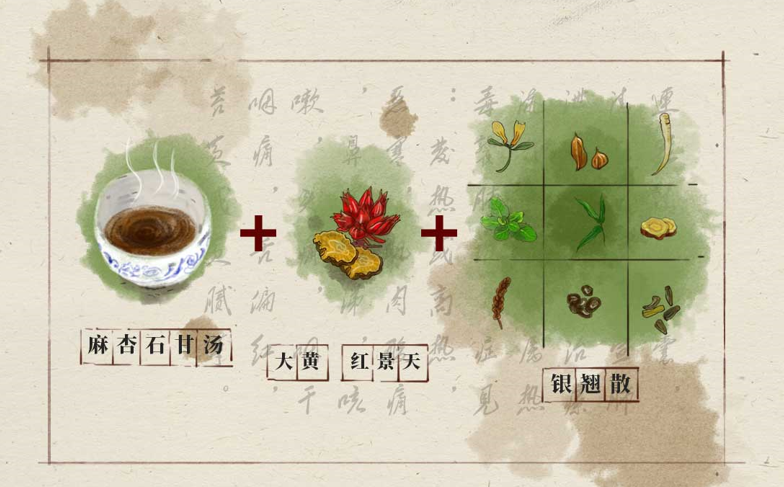 连花清瘟全方由连翘、金银花、炙麻黄、绵马贯众、板蓝根、石膏、薄荷脑、广藿香、红景天、鱼腥草、大黄、炒苦杏仁、甘草13味药物组成。其中,麻黄、杏仁、石膏、甘草就是赫赫有名的《伤寒杂病论》名方——麻杏石甘汤。按照《伤寒杂病论》条方中麻黄发外邪,杏仁下肺气,石膏清肺热,这个方子被用以治疗“大热、大渴、大汗、脉洪大”症状。中医认为,寒邪入侵人体首先会引发头项痛等体表的症状即表证,然后会逐渐向里走,等出现高热、神昏、谵语时,就是寒邪已入里了。麻杏石甘汤恰恰适合治疗表邪未解且邪热壅肺的阶段,这是疾病转归最重要的阶段。在这个阶段控制住病情发展,高烧才有可能退去,疾病才有可能好转。后世历代中医对这个处方不断发挥,只要符合肺经郁热内闭、肺气不宣病机,支气管炎、哮喘、肺炎等疾病都可以用这个处方治疗,可见其对于肺系疾病有一定普适性。连花清瘟将麻杏石甘这一经典方剂纳入其中,正是汲取了汉代中医抗疫的智慧。