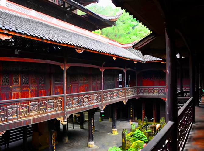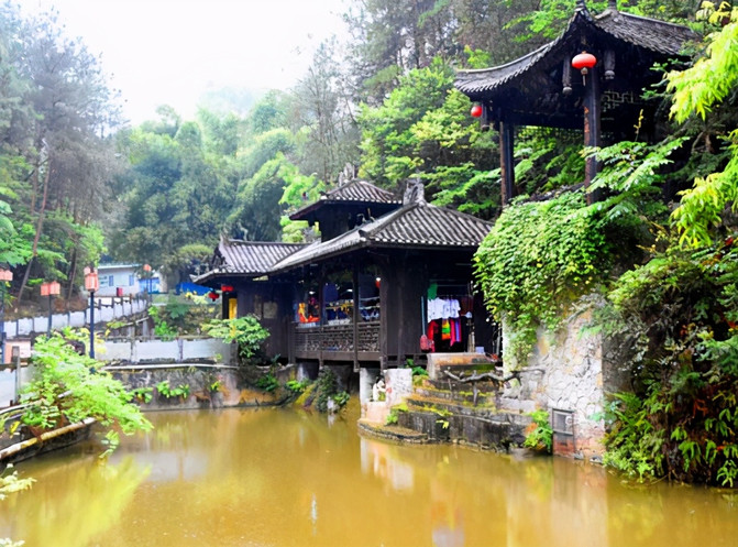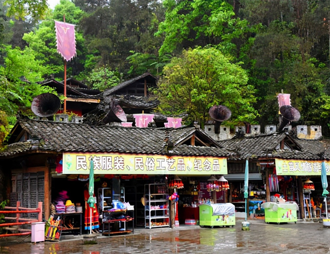在九进堂前面广场的一侧还有土家族民居。这里是典型的土家族民居建筑--吊脚楼。吊脚楼多依山傍水而建,房前屋后多植果木与竹林。在绿树掩映中,一楼挑出,凸显出“小桥流水人家”的优美。