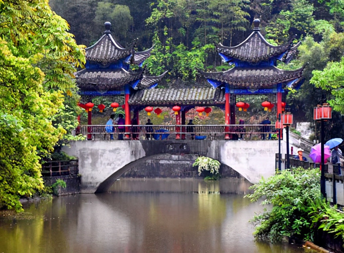 走进土司城不远就能看到一座仿古侗族风雨桥,两座桥亭耸立于桥廊之上,飞檐翘角,画栋雕梁,十分精致美观。风雨桥多建于河流渡口之处,桥廊两边专设有栏杆和长坐板,以供肩挑背驮的商旅行人歇气纳凉、遮荫避雨,因而称“风雨桥”。这座风雨桥虽无挑担背力的行人过往,但却是游人歇息或休闲纳凉、聊天、摆龙门阵或恋人幽会的绝好地方。