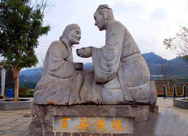 这则“孝母”的故事在蜂岩流传至今,成了蜂岩百姓的家训。为了美化社区,蜂岩镇决定修建社区广场,联想到“孝母”故事,社区决定在广场立“孝母”石像以训诫后人。取百善孝为先之意,广场冠名“百善广场”。记者看到,已经完工的“孝母”雕像雕工精细,栩栩如生,孝子跪立在生病的老母亲面前,为老母亲喂食蜂蜜,母子情深令人感慨和深省。