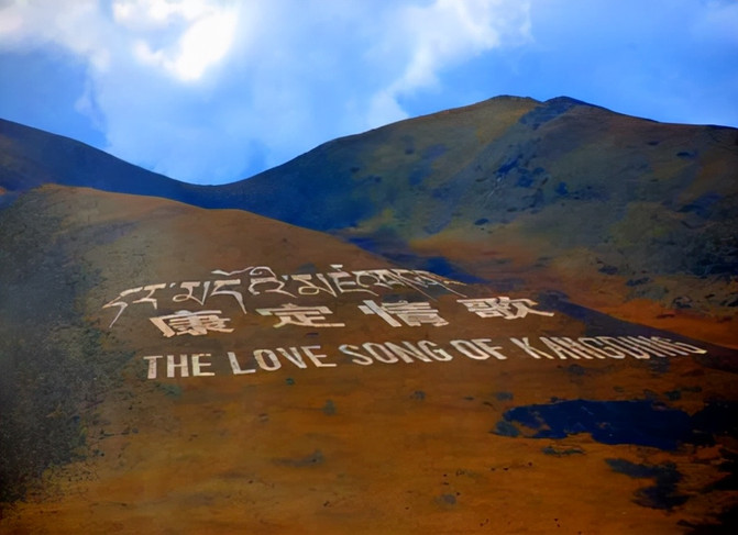 突然,透过大巴车玻璃,记者远眺前方高高的山坡上,一处由藏文、汉字、英文所组成的“康定情歌”四个白色大字的景致,在绿茵茵山体的背景下,赫然醒目地撞入了人们的眼帘。