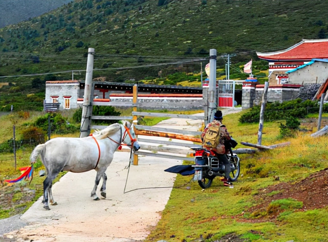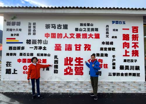 此外,正对着牌楼对面的路旁还有一座砖墙,在白底色的墙面上有着“中国的人文景观大道圣洁甘孜”、“一路向上 百折不挠”、“此生必驾”及“茶马古道”、“格聂神山 一方净土”等一些红黑相间的大字,充分展现了自驾旅游者们其智慧的想象力。