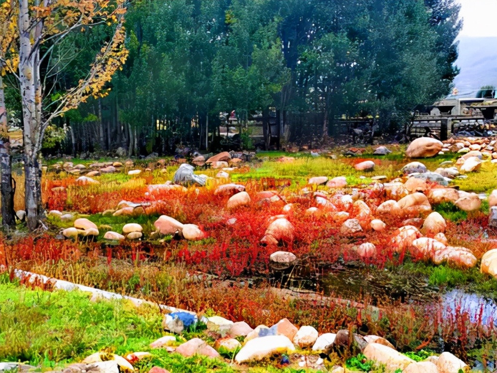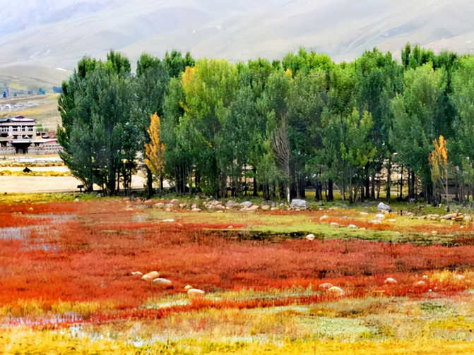 位于公路服务区一侧的红草湿地,如果不是秋天,这里的景色绝不会特别吸引人们的注意力,一个仅足球场大小的水草滩地,水中及岸边花岗岩质的冰川漂砾物随意地摆放着,几只小猪在水边的草地上拱食,乱泥翻搁了一地。