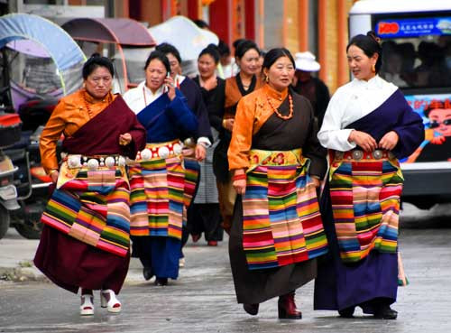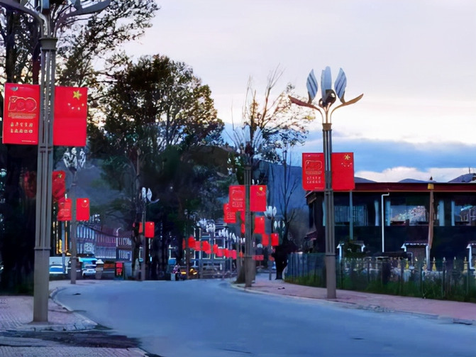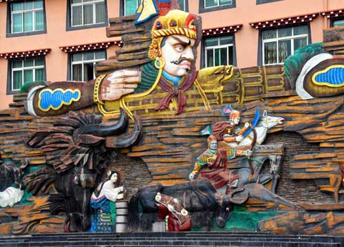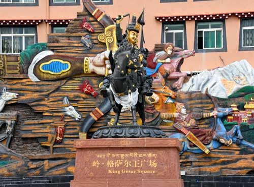 广场中心矗立着一座格萨尔王跃马扬鞭的雕像,背后则是一副展现壮阔历史画卷的壁画,壁画的人物与景物图像个性鲜明,极其生动。如今这里是全民老少休闲娱乐的聚集地,晚上成群结伴挥袖起舞形成了理塘一道亮丽的风景线。格萨尔王广场作为理塘最大的文化和地标性广场,犹如天府广场对成都的象征意义。