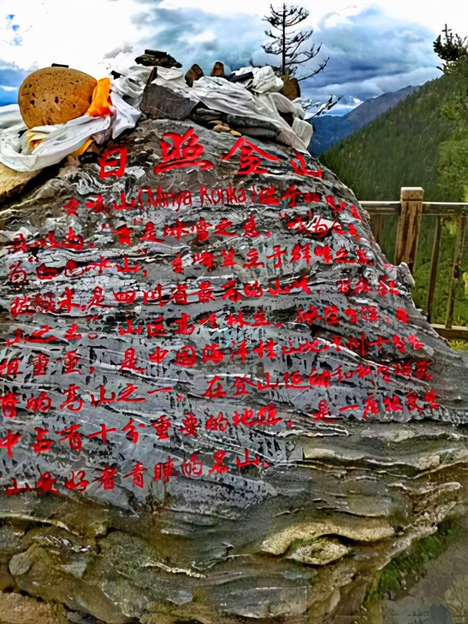 在这个垭口观景台上还有一座石刻,镌刻着“日照金山”几个大字,从这里可以远眺蜀地第一高峰贡嘎山,虽然看不清远处贡嘎山真身,但波谲云诡的高天云层,伴以眼前的挺拔青松,更增加了贡嘎山的壮阔、神秘和幽远。