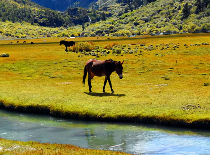 在洛绒牛场,贡嘎河从草场穿梭而过,林间溪流跳跃,水声潺潺,高高低低的树木与一间间木屋相映成趣,是附近藏族村民的天然高山牧场。草场中央有大片的沼泽湿地,湿地中又分布着无数个的小水洼,据说清晨时分,这些水洼会将央迈勇倒映成纯粹的金黄。
