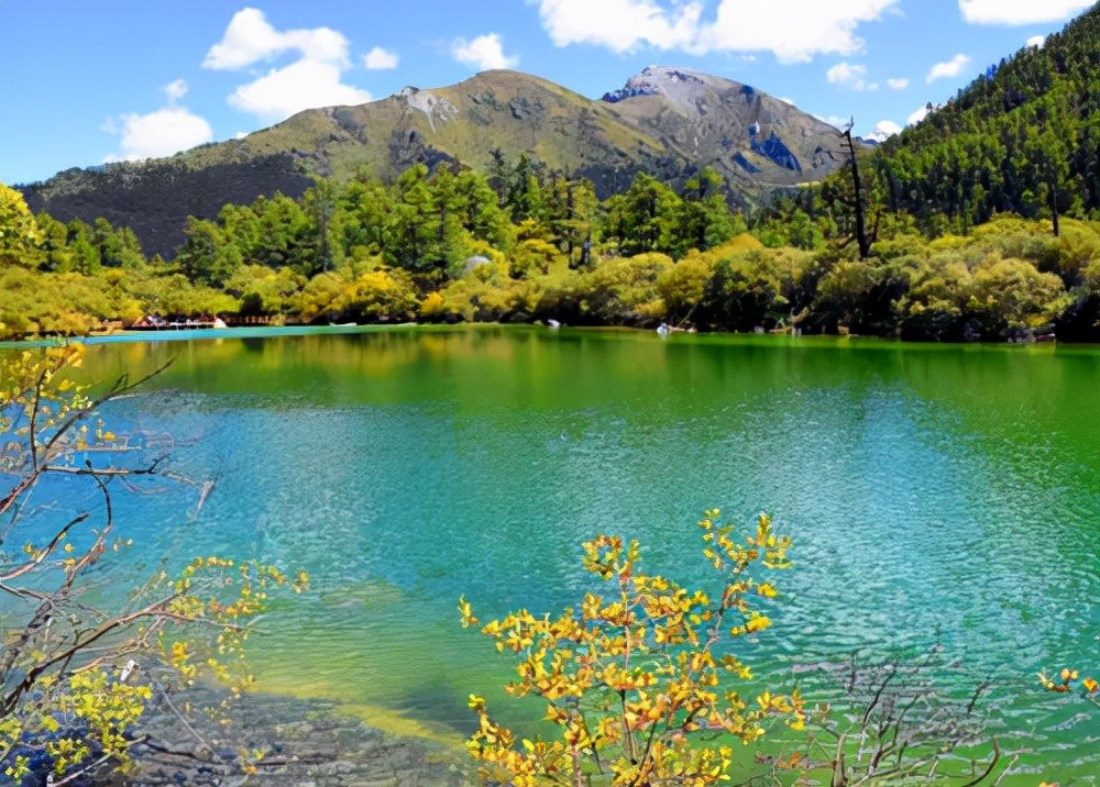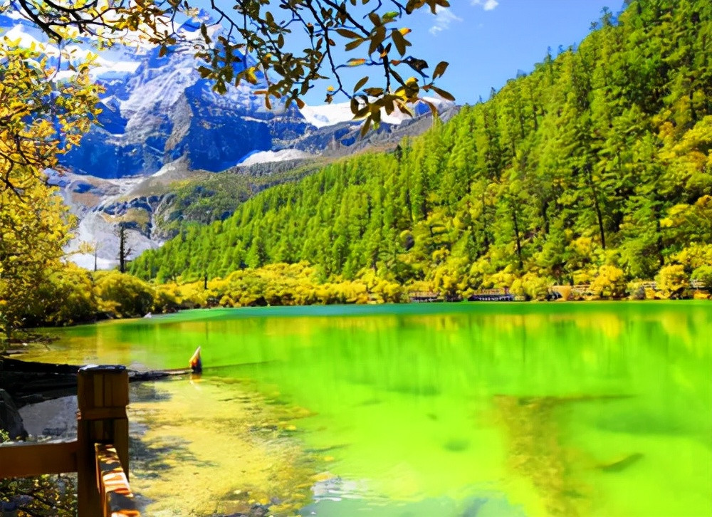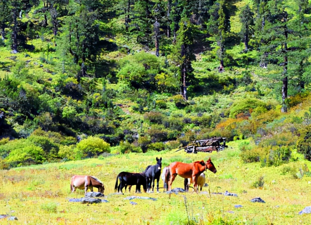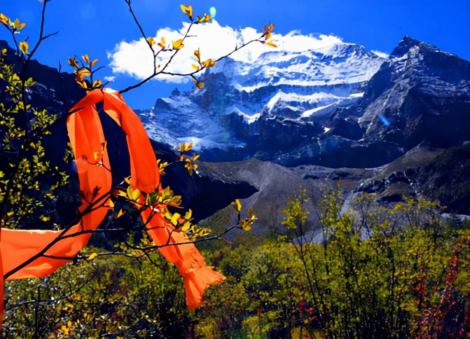 洛绒牛场北侧山坡的灌木丛到了秋季一片通红,而夏诺多吉山脚下的落叶松林也由红、黄、蓝构成了“香格里拉之魂”最简洁而又内涵丰富的色彩。这里还是通往五色海、牛奶海的起点,也是由冲古寺出发的仙乃日小转山路线的必经之处。