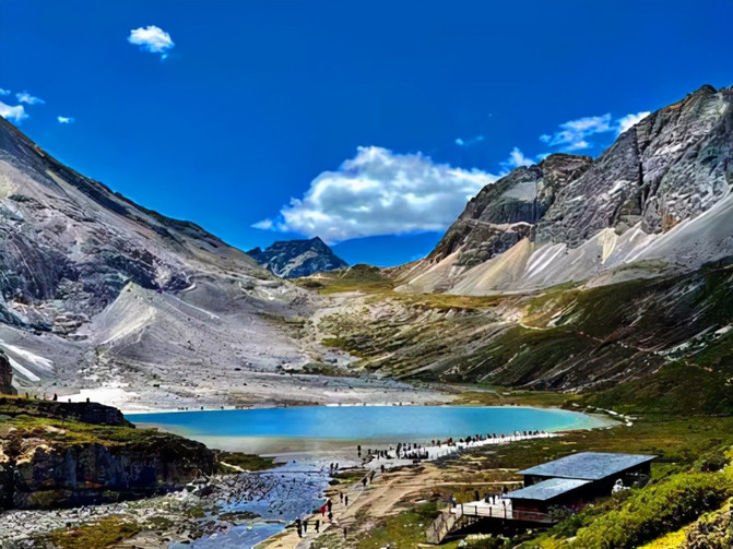 拍下五色海的美照,又从上往下走到达海拔4600米的牛奶海,又叫俄绒措。牛奶海位于央迈勇神山脚下的山坳里,是一个面积不大状如水滴的古冰川湖。这里四周雪山环绕,湖水清莹碧蓝,湖畔则是一圈乳白色环绕,故称牛奶海。