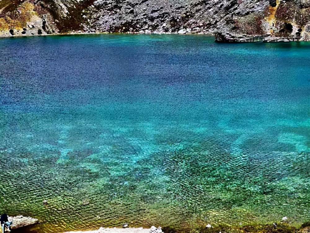 这里的湖泊形状象一滴眼泪,站在高处向下看,她就像一块纯净的蓝松石嵌在雪山群峰中,神圣而美丽。湖泊中间呈蓝色,四周被雪山环绕。岸边的水面略深,水下是古老植物的沉积,稍往里的湖水是浅绿色,再深处便是碧蓝色,蓝得透亮。