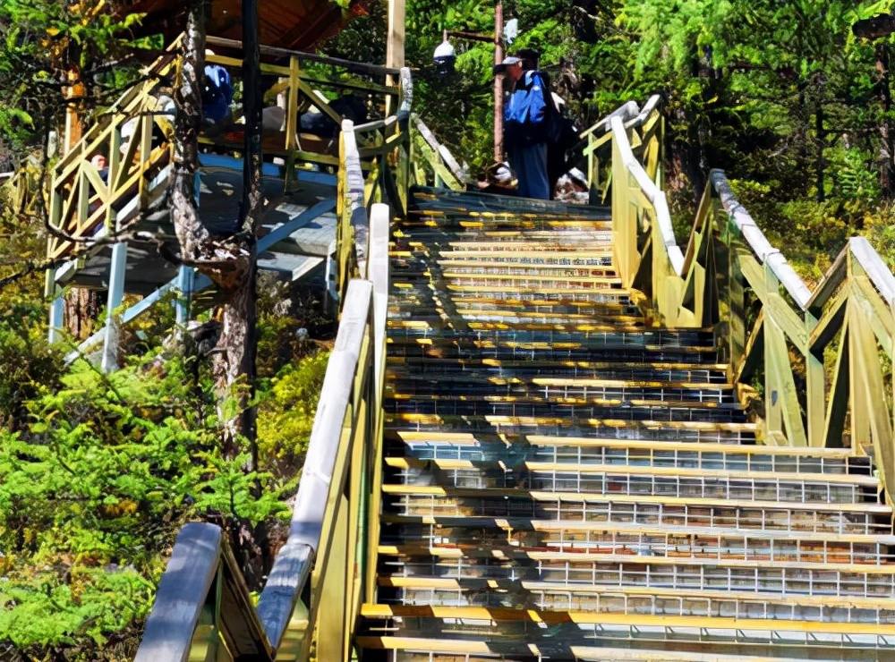顺着水畔木质栈道继续缓步上行走一段来到了仙乃日观景台。穿行在树林中,由于正值初秋的到来,林中的落叶松与山杨树有的已经变得发黄,其它的树种有的发红,途中俯瞰,在层林尽染,蓝天、白云、雪山、森林交相辉映中的珍珠海,其碧波荡漾水中倒映着五光十色的风景,令人赏心悦目。