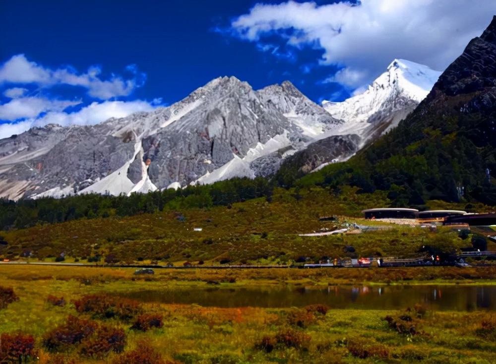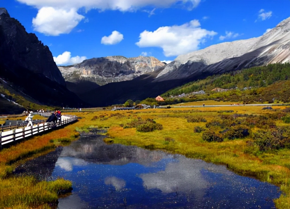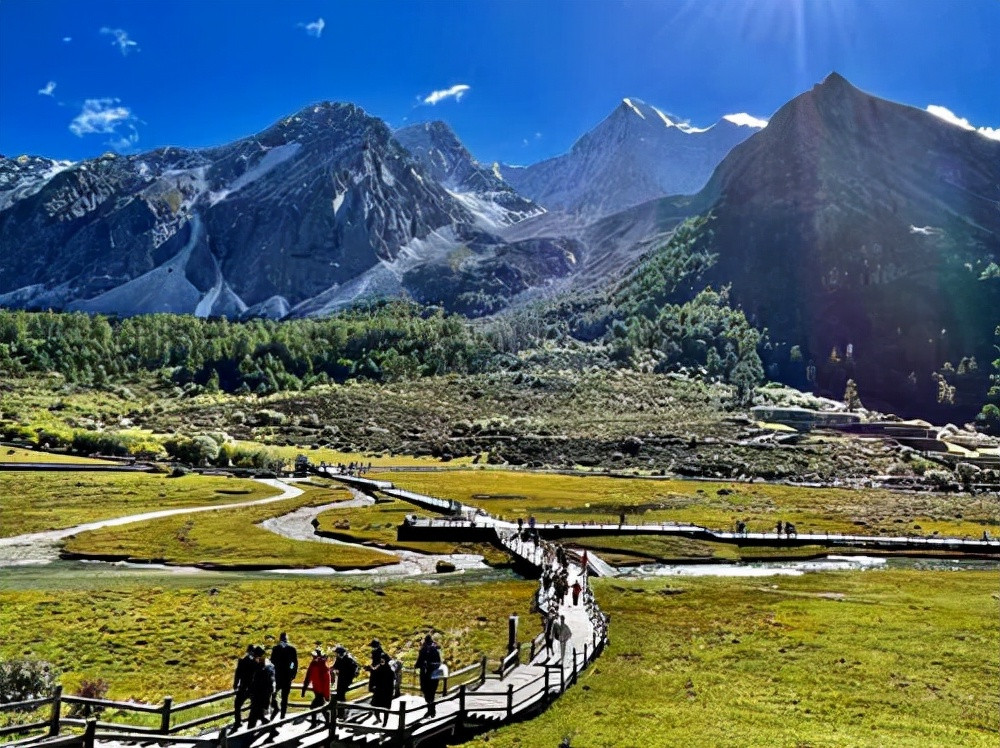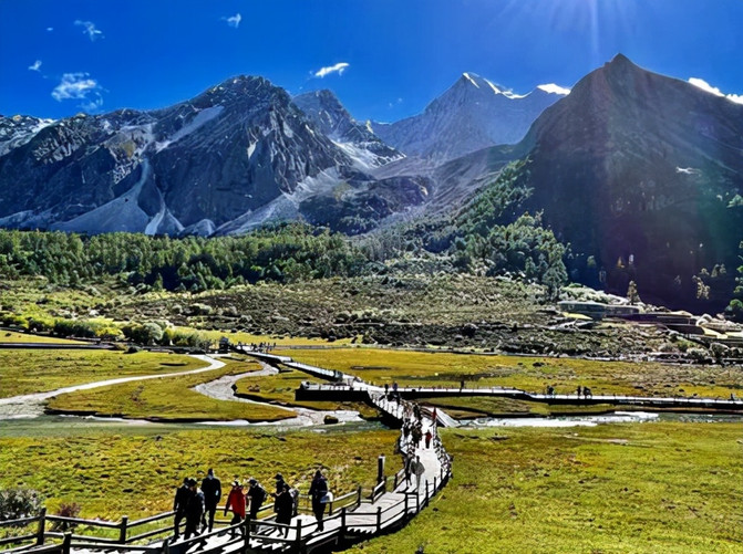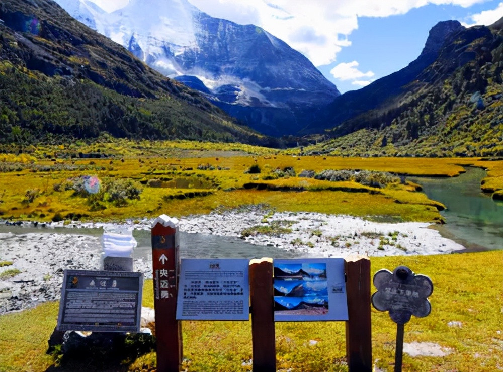 记者用了四个小时左右走完了所谓的稻城亚丁短线后重新回到扎灌崩枢纽中心,看了一下表已是下午两点半,于是又继续乘小观光车前往长线起点出发地的即终点站洛绒牛场。在途中,由于记者坐在副驾驶位置上,在长约7公里的途中,蓝天白云下的仙乃日、夏诺多吉和央迈勇三座雪山依次显现,壮美的景象真是令人心醉。