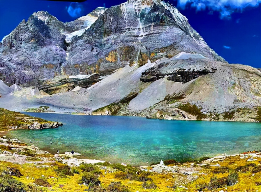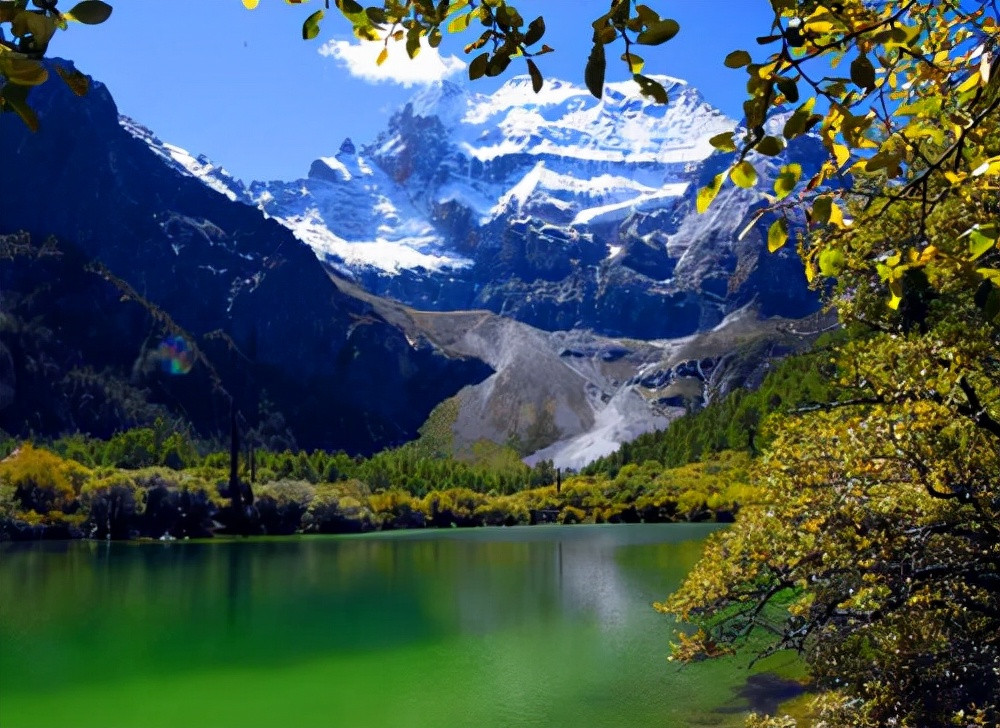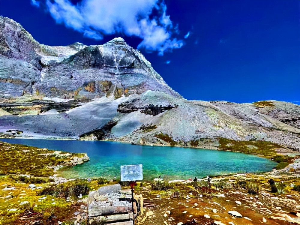 五色海的现代冰谷下伸至湖畔,雪山倒影湖面,呈现奇幻的色彩。在雪山的包围下,像极了仙乃日的一滴眼泪。东山崖上瀑布飞流,珍珠万颗直泻湖中,湖水澄澈似镜,朝阳初临,瑞气四集,飞瀑倒映湖中,山形呈玉兔,傍晚捧佛隐去,清晨阳光出霞,五彩缤纷,这是一处被人忽略的自然经典。
