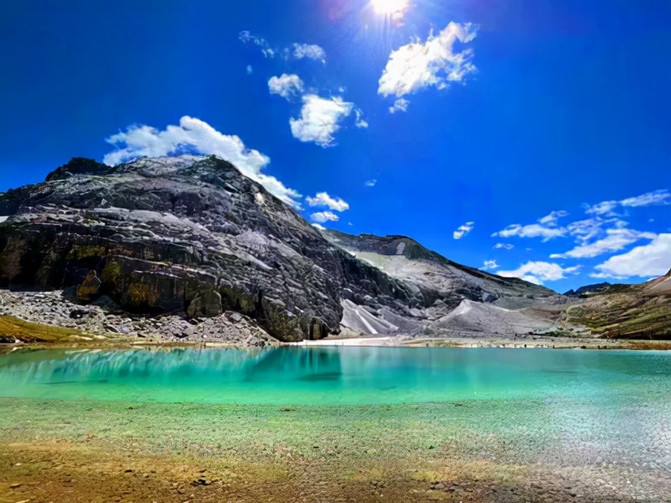 牛奶海湖水深浅不一,近岸由于湖底远久植物的沉淀而略显黑色,越到深处越蓝得透亮。从早上八点开始进景区到牛奶海6个小时,我一杯水、一个麻花、带了一瓶氧气一点没吸,你看是不是还精神十足蓝色星球上的最后一片净土,一生必游香巴拉。人生的仙境,神圣的美景。看了上述节选团友马秀玉图文并茂的一段微文,在弥补记者稻城一日游遗憾的同时,深感川之巅的稻城亚丁之行真是不虚此行。(图文:冯赣勇)