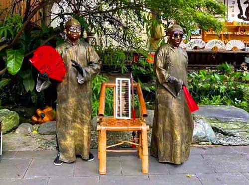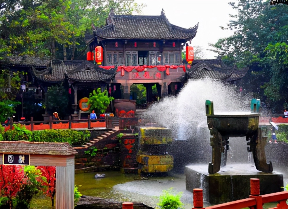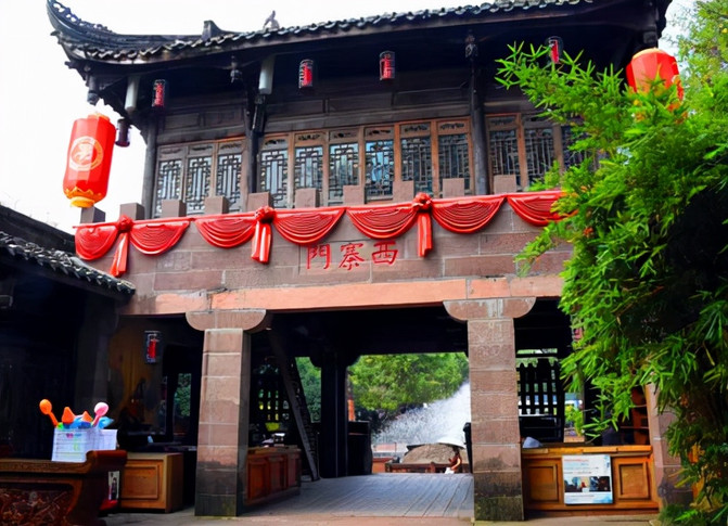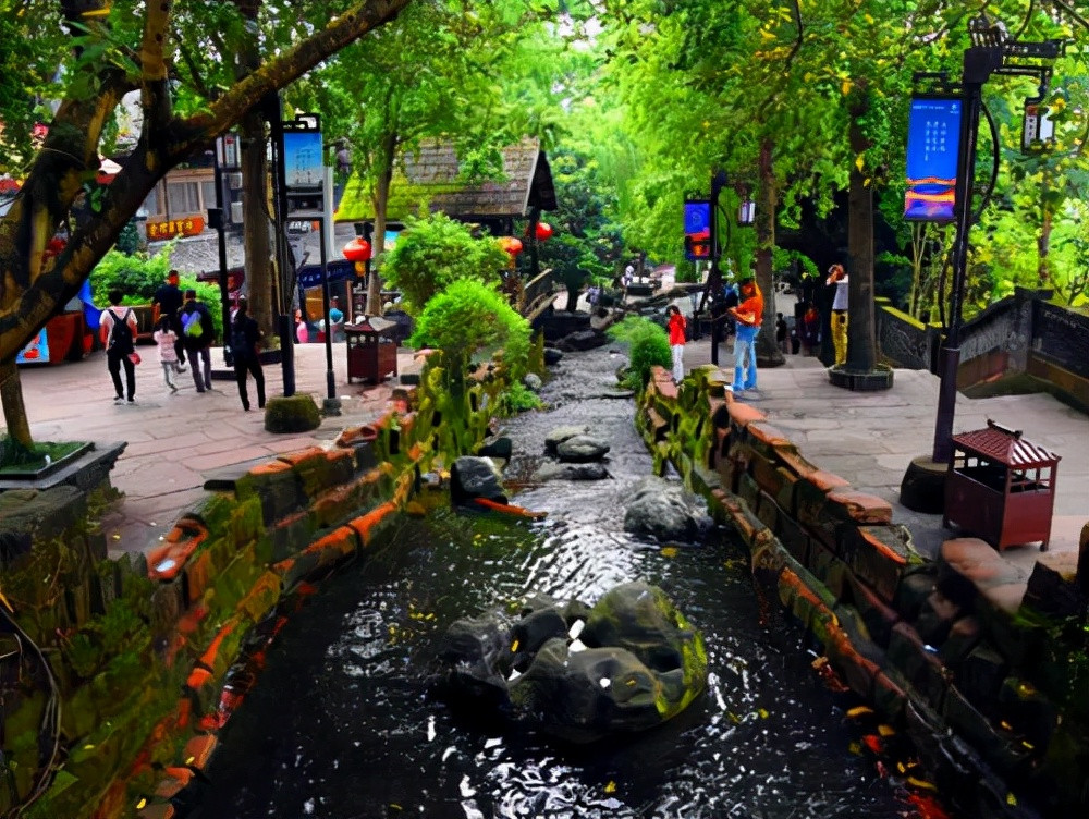 顺路来到景区中一处喷泉龙劲飞瀑中心有巨鼎的广场,从这里才是真正来到黄龙溪古镇入口,进入古镇西寨门,顿时一幅具有江南风味的景象撞入人们的眼帘。从龙头喷出来的溪流,从上而下形成一条悠长的水路伸向黄龙溪古镇的深处。水道两旁的店铺鳞次栉比,异常热闹。