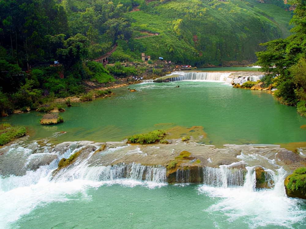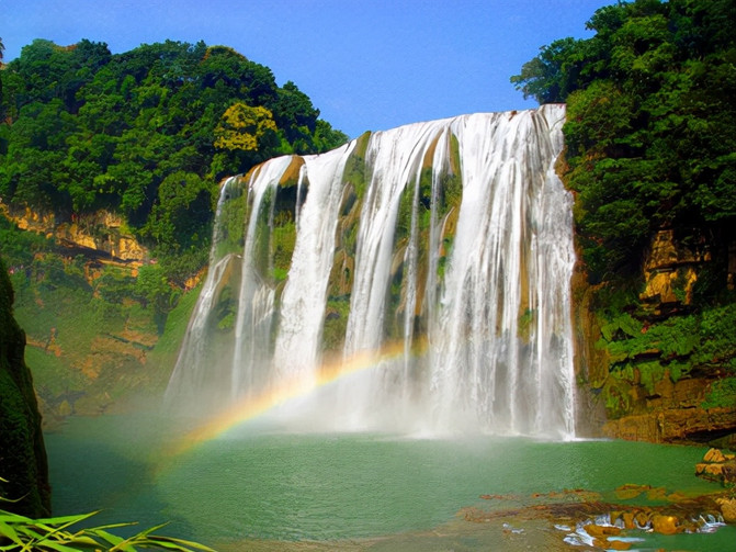 雄伟壮观的黄果树瀑布高60米,宽20米,夏季最大流量每秒可达2000立方米。打帮河的河水形成瀑布后垂直倾泻入犀牛潭,悬崖凝雪,水烟飘洒,雾气生腾。明代地理学家徐霞客在《游记》中赞道:“捣珠崩玉,飞沫翻涌,如烟雾腾空,势甚雄厉,而从无此阔大者。”