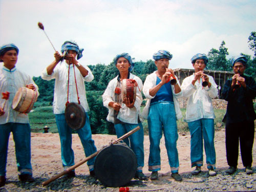 唢呐铜鼓舞通过布依族青年男女手持竹制的各种响器,在唢呐和铜鼓的伴奏下边击边舞。女子舞姿轻柔优美,男子的舞步则刚劲有力。唢呐铜鼓舞表现了布依族人民欢庆佳节,祈求天地神灵保佑越人后裔安居乐业、五谷丰登的美好愿望。祝愿布依族人民能像黄果树瀑布一样永远生生不息,生命之树长绿。(图文:冯赣勇)