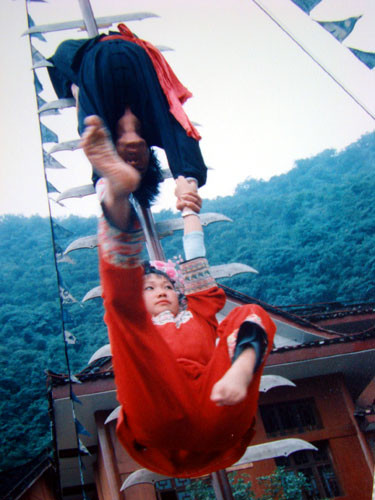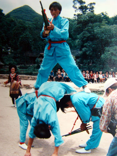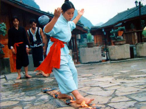 6月15日下午,摄制组在结束了乌当永乐布依族舞龙的拍摄在贵州民委张处长与令狐彩梅二位同志的陪同下,先后前往清镇风光秀美的红枫湖及挖力小康村寨,分别观赏了苗族的绝技神功《上刀山》、《下火海》及《芦笙舞》等三个表演项目。