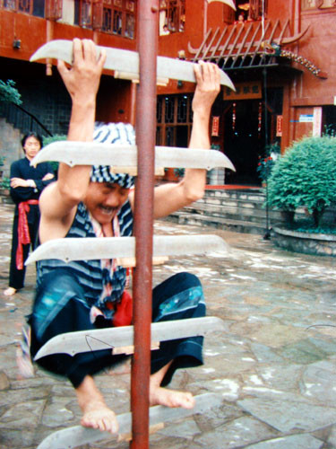 “上刀山”也称“上刀梯”,刀梯由一根高12米的铁柱,72把锋利无比的钢刀和顶端上边3把寒光逼人的钢叉组成。在贵州红枫湖民族村的表演者,如今已是龙氏家族的第五和第六代传人了。在整个上刀山的表演中,表演者要赤脚而上,并在刀梯上表演“金鸡独立”、“顶天立地”、“单臂吊刀”、“倒挂金勾”、“百猿出洞”等各种高难度,惊险刺激的空中动作。