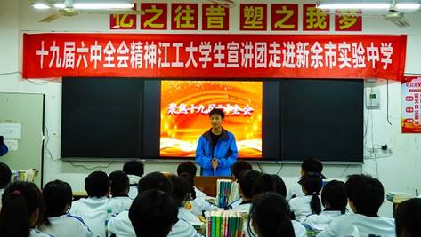 为深入学习贯彻党的十九届六中全会精神,大力弘扬建党精神,12月3日下午,江西工程学院"十百千"宣讲团走进新余市实验中学宣讲党的十九届六中全会精神。校宣传部部长于永清亲临现场指导,新余市实验中学副校长黎海及老师安排进班议程。