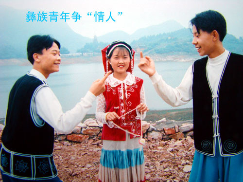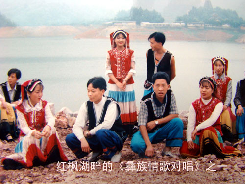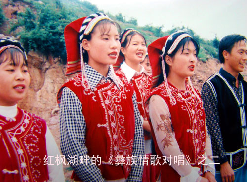 随行的民委同志介绍说,彝族青年男女经常采用情歌对唱的方式来寻觅自己的心上人。于是,在风光秀丽的红枫湖畔,我们的摄像机记录了十分生动的彝族男女青年们以歌抒情传意,对歌的场景。有时几对恋人会在歌声中同时结为情侣,但也有的小伙子可能会一无所获。甚至还有两个男青年争抢一个姑娘的有趣景象。