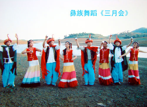 彝族人民能歌善舞,逢年过节,舞蹈表演是一个很重要的内容。彝族舞蹈形式多种多样,有喜迎宾客的《洗尘舞》;有欢庆丰收的《铃铛舞》;也有庆贺民族传统节日的《七月欢歌》,还有表现彝族青年追求爱情的《三月会》等等,真是五彩缤纷,热闹非凡。