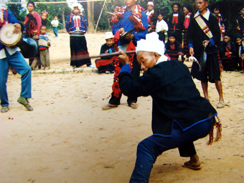 在三台山村寨拍摄时,我们正赶上寨子里为整修一座寺庙举行开工仪式,附近几个寨子的乡民都从四面八方赶来了,小小的村寨里好似过节一样热闹。象脚鼓手们都身穿节日盛装,云集在村寨寺庙前的一个小广场上。他们既是领舞人,也是伴舞者。在热烈欢腾的气氛中,他们尽情狂舞,从而抒发他们心中的喜悦。蓝天白云下的德昂族山寨,经常会看到摔跤玩耍的孩子们,但是成人们所喜爱的却是各种传统民间武术运动,像《刀术》、《棍术》以及双节棍等项目都是德昂人在劳动闲暇或传统节日中时常表演的。这些项目与传统武术有不同之处,它们是武术与舞蹈相结合的产物。据说,这些项目的套路大多为德昂族先人的祖传。表演时动作优美流畅,既强健了体魄又带来了身心的愉悦。