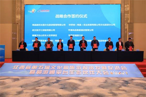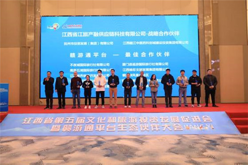 江旅九州产融平台、江旅科技赣游通平台举行了合作单位签约颁奖仪式。抚州市投资发展(集团)有限公司、江西赣江中医药科创城建投资集团有限公司、南昌融创主题文化旅游管理有限公司、华侨城(南昌)实业发展有限公司文化旅游分公司、武汉扬子江游船有限公司等8家合作伙伴现场签订合作协议。不夜城国际旅行社、云南金鹰国际旅行社、南昌五湖国际旅行社、铜源峡风景区等10家合作伙伴荣获“2021赣游通最佳合作伙伴奖”。