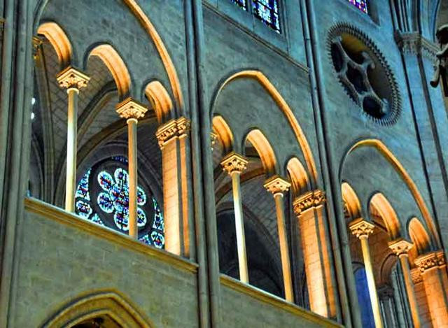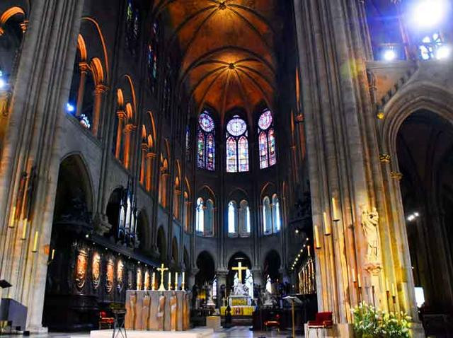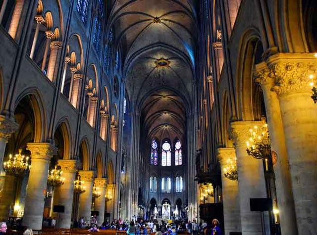 走进圣母院内,四处可见虔诚的信徒双手交叉合拢抵住下巴,闭眼凝神虔诚的祈祷,更突显巴黎圣母院的庄重肃穆。再看其里面富丽堂皇的景象,人们不禁为它的宏伟气势所震惊。几排直径5米的大圆柱将内部分为五个殿,而在十字交叉堂和唱诗堂周围还有两个回廊环绕。并排着两列长柱子,柱子高达24米,直通屋顶。两列柱子距离不到16米,而屋顶却高35米,从而形成狭窄而高耸的空间,给人以向天国靠近的幻觉。