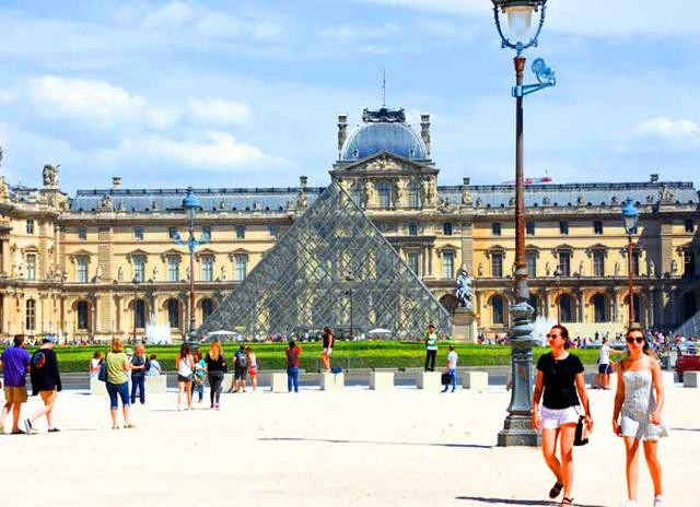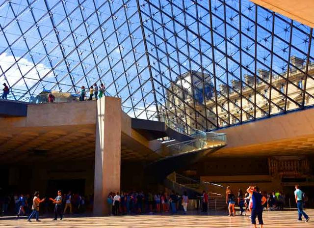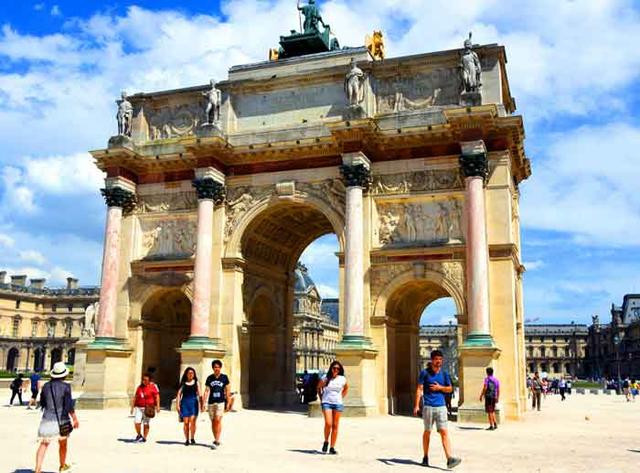 顺着甬道径直来到卢浮宫前,最先看到的是一座凯旋门,凯旋门后面就是卢浮宫正门口的那座由美籍华人建筑师贝聿铭设计的透明金字塔建筑。卢浮宫这个举世闻名的艺术宫殿始建于12世纪末,当时是用作防御目的,后来经过一系列的扩建和修缮逐渐成为一个金碧辉煌的王宫。